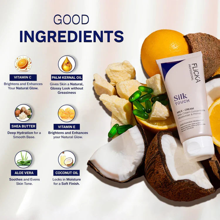 Flicka Silk Touch Concentrate is a multi-purpose 3-in-1 formula designed to moisturize, prime, and protect your skin in one simple step. Its lightweight milk-cream texture melts into the skin, delivering deep hydration while creating a smooth, pore-blurred base for makeup. Non-greasy and fast-absorbing, it enhances makeup longevity and leaves your skin soft, silky, and naturally radiant all day.