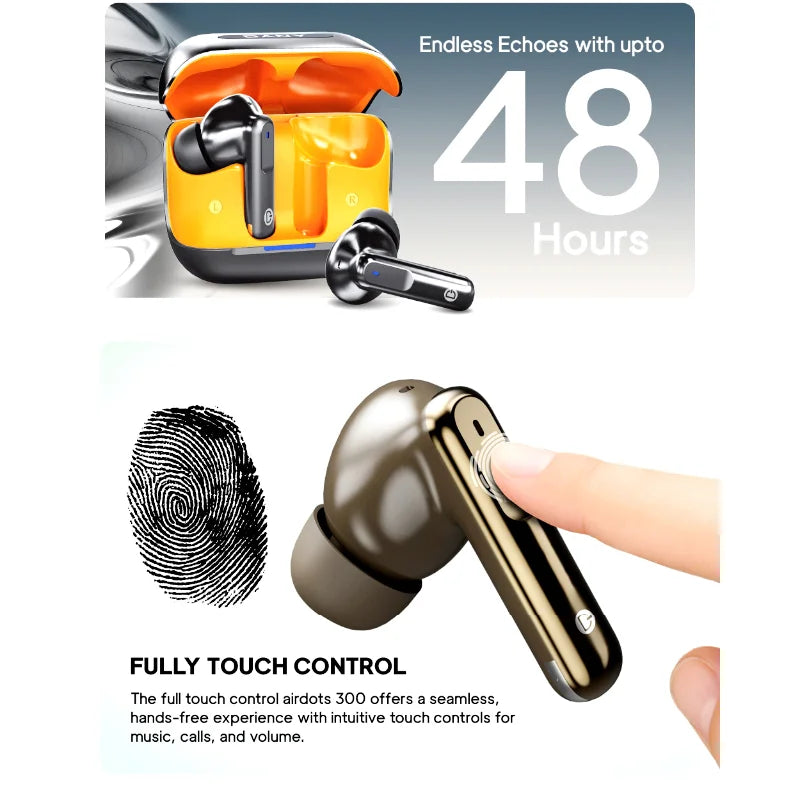 Dany Airdots 300 Pro advanced True Wireless Stereo (TWS) earbuds hain jo powerful audio aur smart features ke sath aate hain. Quad Mic ENC (Environmental Noise Cancellation) technology calling ke dauran background noise ko kam karti hai, jis se voice clear aur professional lagti hai.
